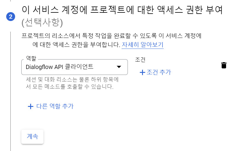 4) 만들 때 역할은 Dialogflow API 클라이언트로 하고, JSON 유형으로 키를 발급한다.