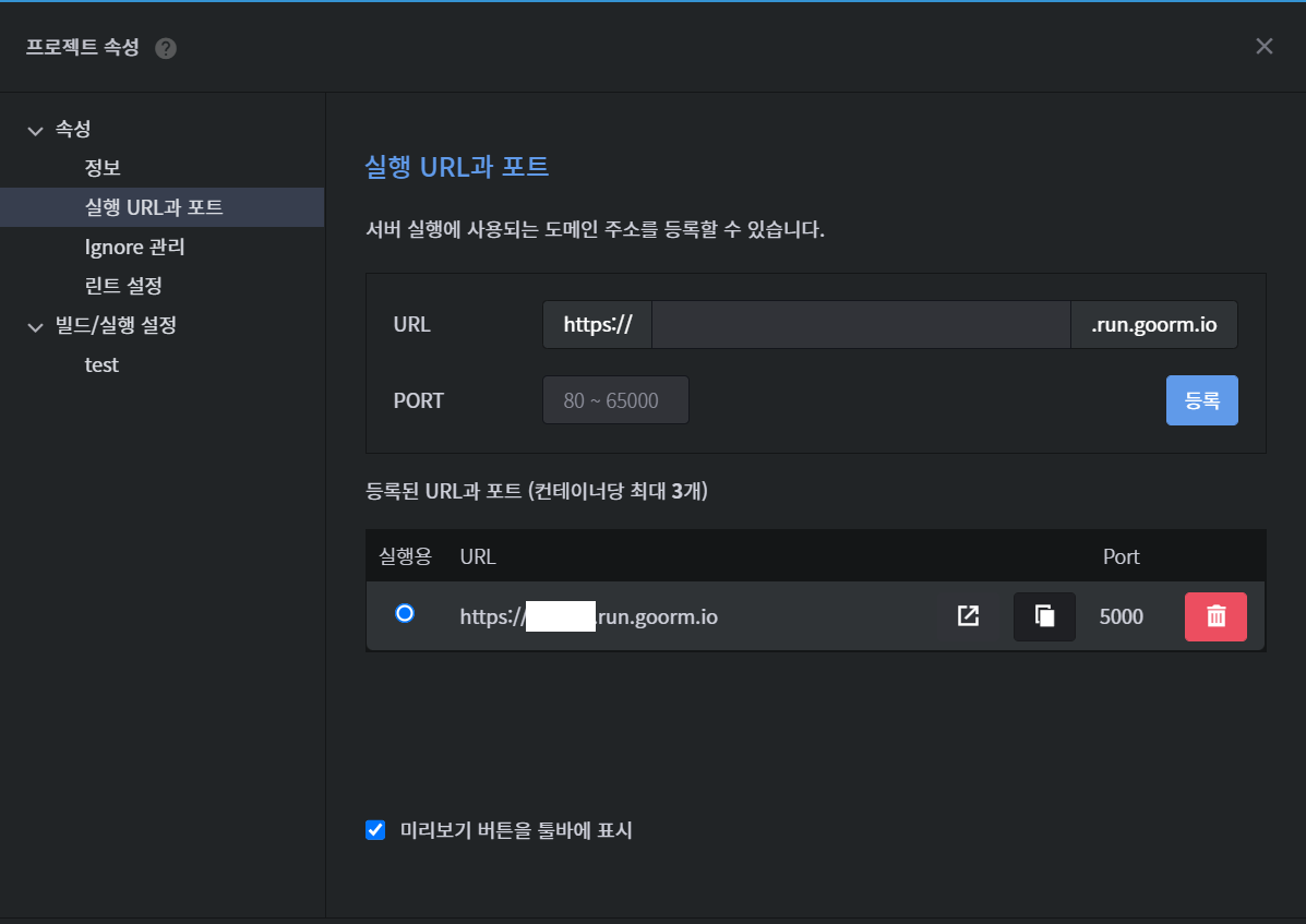 포트 5000번으로 도메인 주소를 등록하였다.