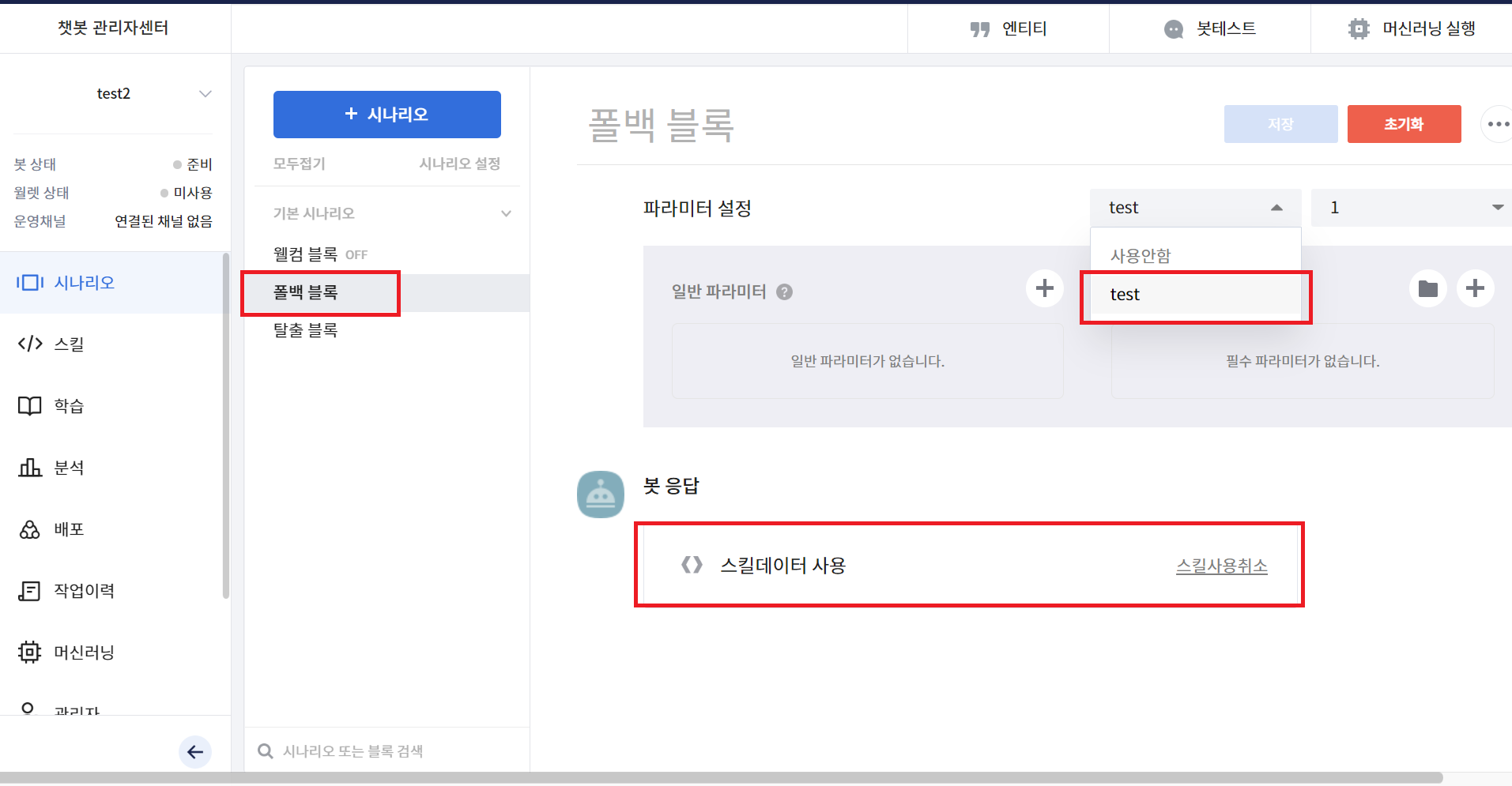 그리고 폴백 블록에서 스킬을 지정해 주고, 봇 응답에서 스킬 데이터 사용으로 추가해 준다.